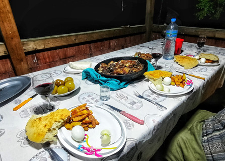 Nach einer Guten Stärkung gehts auf, um die Fischernetze einzuholen und die Schafe auf die Weide bzw in die Natur zu treiben. Leider gab's nur zwei kleine Fische ab da wir noch außerhalb der Saison sind. So gehts für uns zurück zu ihm wo mittlerweile seine ganze Familie gekommen ist. Wir bekommen Mittag so was ähnliches wie ausgezogene Nudeln mit super Honig, natürlich alles selbst gemacht.